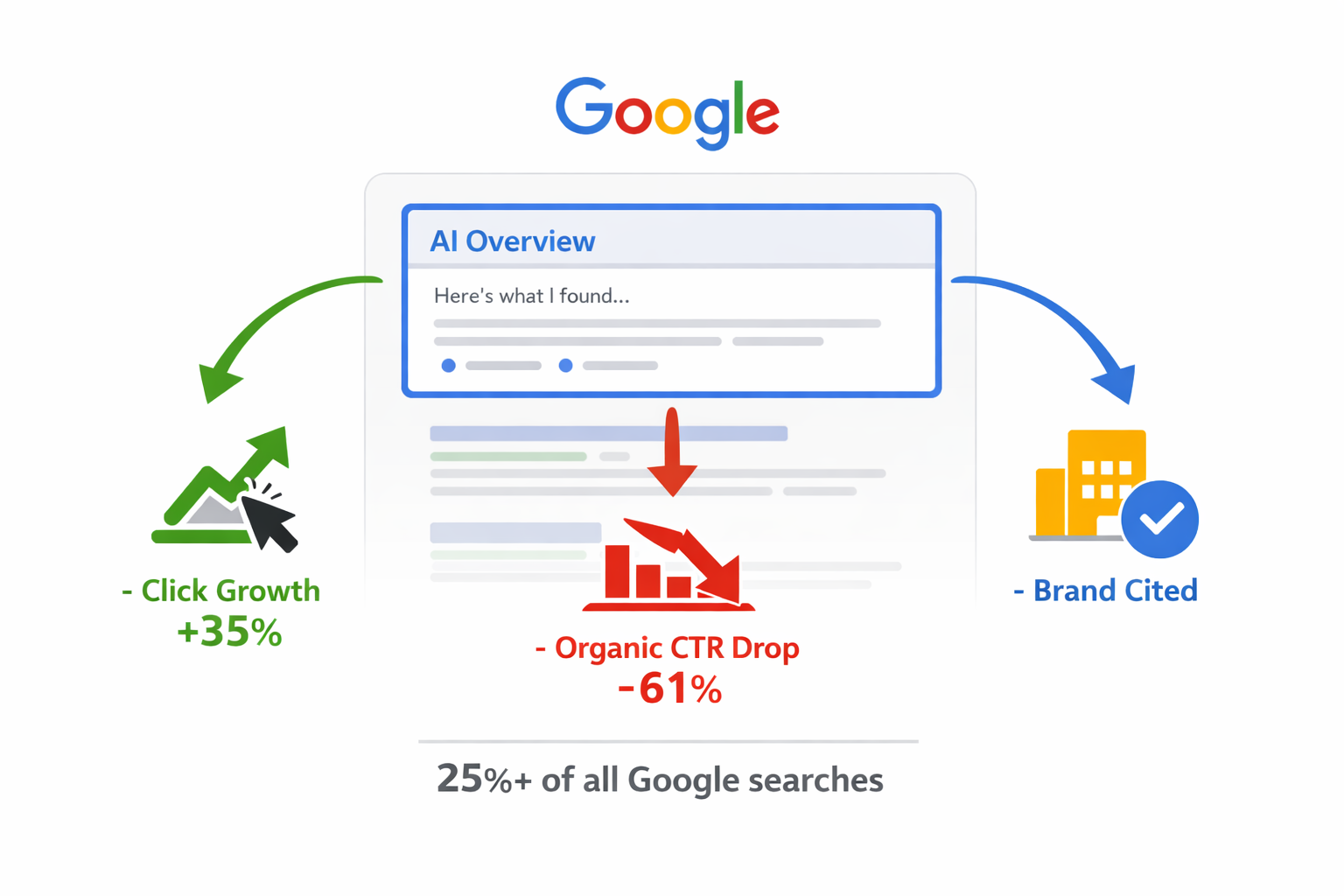 Google AI Overviews now appear on more than 25% of all searches, up from 13% a year ago. For queries starting with "best," that number jumps to 83%. When an AI Overview shows up, organic click-through rates drop by 61% on average. But brands that get cited inside those overviews earn 35% more organic clicks and 91% more paid clicks than brands that don't.