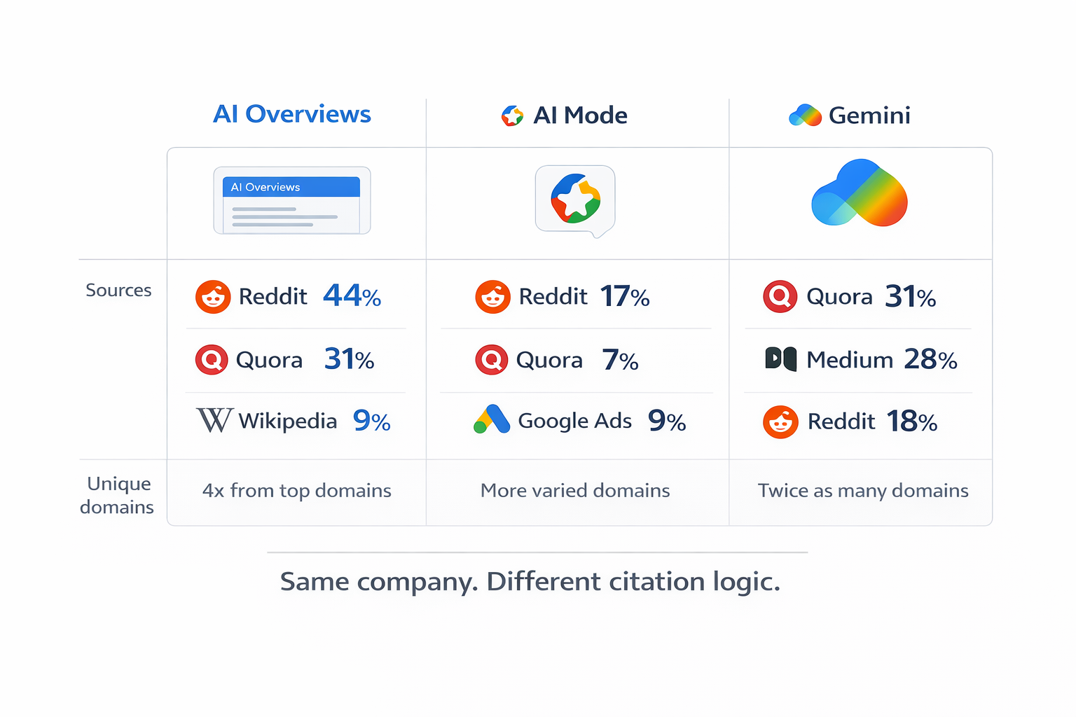 One of the most counterintuitive findings from 2026 is that Google's own AI products don't cite the same sources. Treating "Google AI" as a single channel is a mistake.