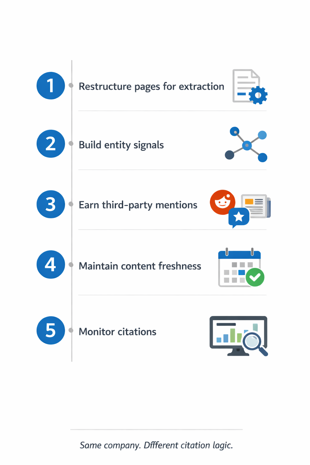 Build your entity signals. Implement Organization schema site-wide with sameAs links to your Wikipedia page, LinkedIn, and social profiles. Add Article schema with accurate dateModified on every content page. Use knowsAbout to declare your topical expertise. These signals help Google's AI confirm your brand as a verified entity worth citing.