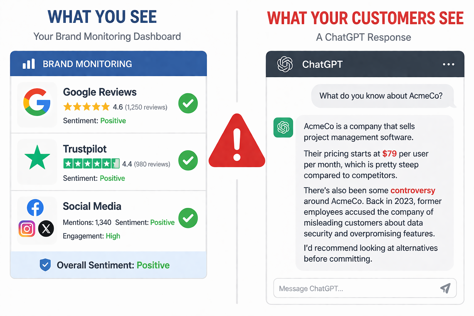 Your G2 rating is 4.8 stars. Your Trustpilot reviews are glowing. Your Google rankings look strong. But right now, someone is asking ChatGPT about your company and getting told you went through a data breach that never happened, or that your product costs twice what it actually does, or that a competitor is "the better alternative" based on a Reddit thread from 2023.
