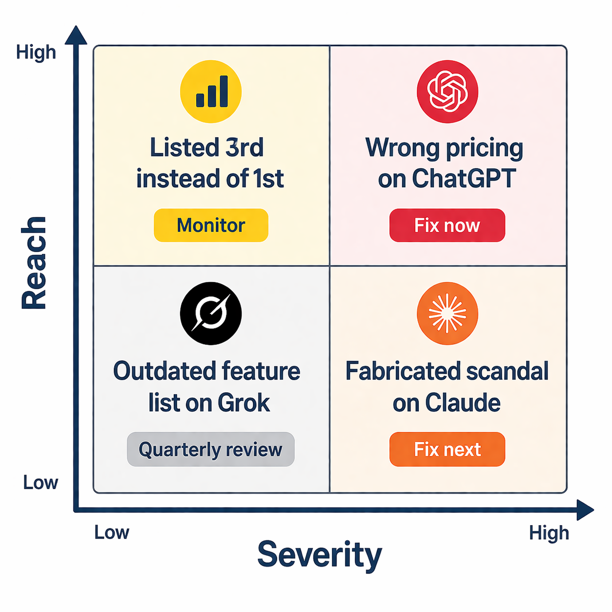 Severity. Fabricated facts (wrong pricing, nonexistent scandals, confused identity) are more damaging than unfavorable framing. A customer who's told your product costs $500/month when it actually costs $50 will never reach your pricing page. A customer who sees you listed third instead of first might still click through.