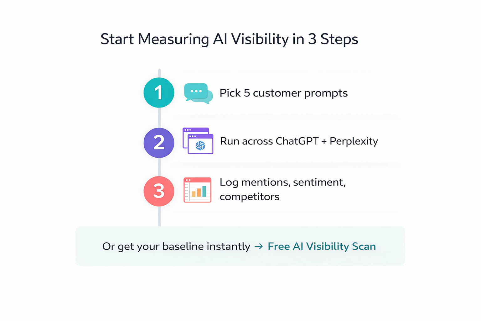 Manual monitoring (free, 30 min/week): Create a list of 10-15 prompts your ideal customers would ask AI systems. Run them through ChatGPT, Perplexity, and Gemini weekly. Log brand mentions, sentiment, and competitor presence in a spreadsheet. This gives you directional data immediately.