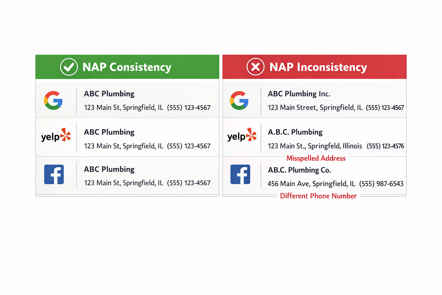 NAP stands for Name, Address, Phone number. And it needs to be identical - character for character - across every place your business appears online. Your website footer, your GBP, Yelp, Facebook, Apple Maps, industry directories, the local Chamber of Commerce listing, all of them.