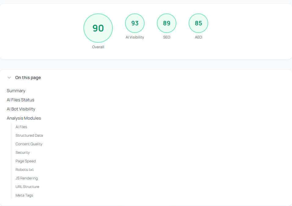 For context, the example in the screenshot above shows an Overall score of 90 with AI Visibility at 93, SEO at 89, and AEO at 85. That's a well-optimized site, though even with those numbers, the report identified 13 issues worth fixing.
