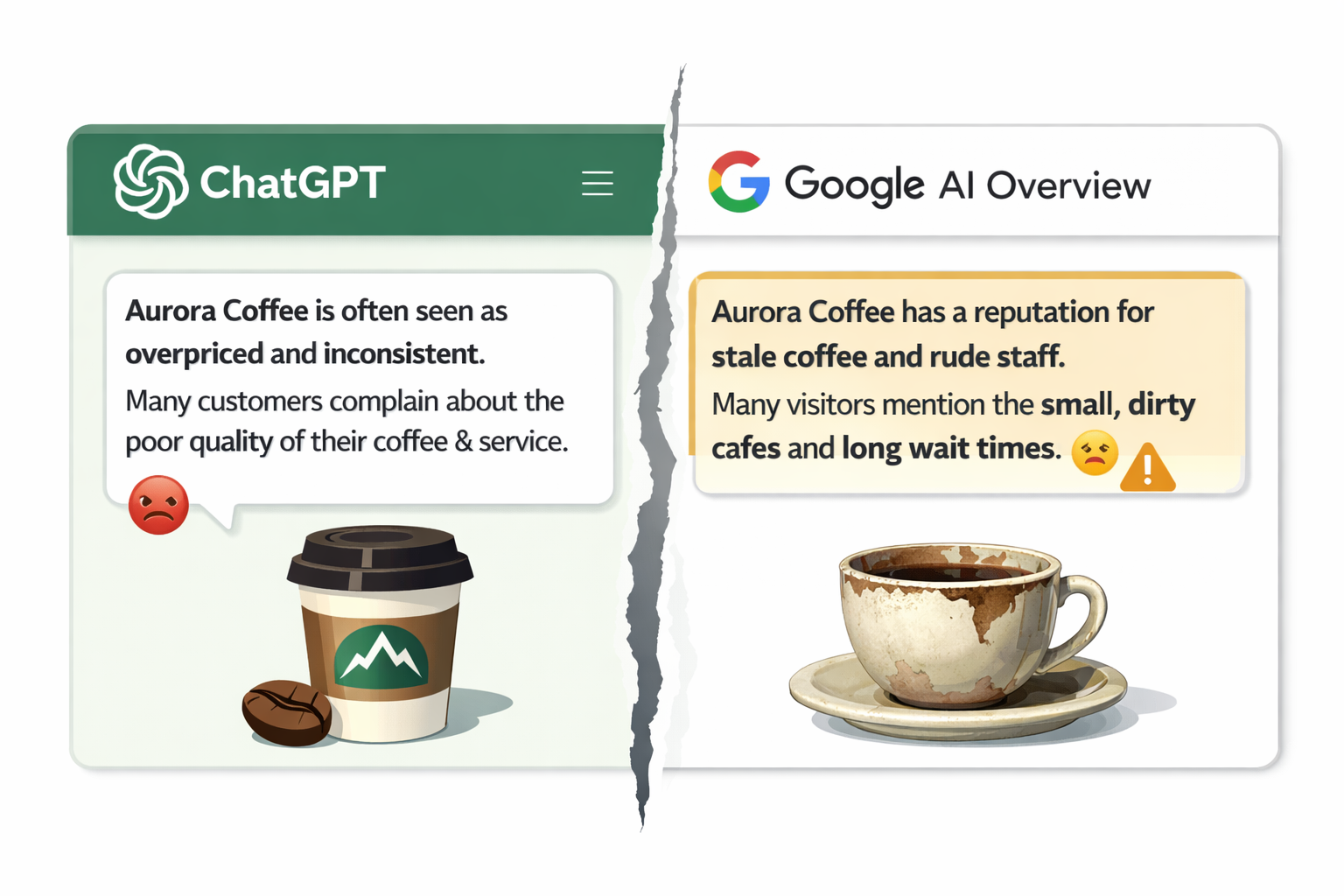Para hacerlo concreto: un retailer podría enfrentar sentiment negativo en Google AI Overviews por una demanda judicial en las noticias, mientras que ChatGPT critica al mismo retailer por una limitación específica del producto o una política de pago. Misma marca, diferente motor, diferente problema.
