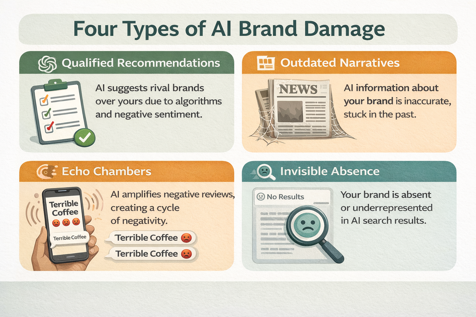 El daño reputacional en IA se acumula con el tiempo. Un único patrón negativo en los datos de entrenamiento se refuerza con cada interacción. Los usuarios que reciben un encuadre negativo sobre tu marca no vuelven a comprobar si la IA se equivocó. Pasan al competidor que la IA recomendó en su lugar.