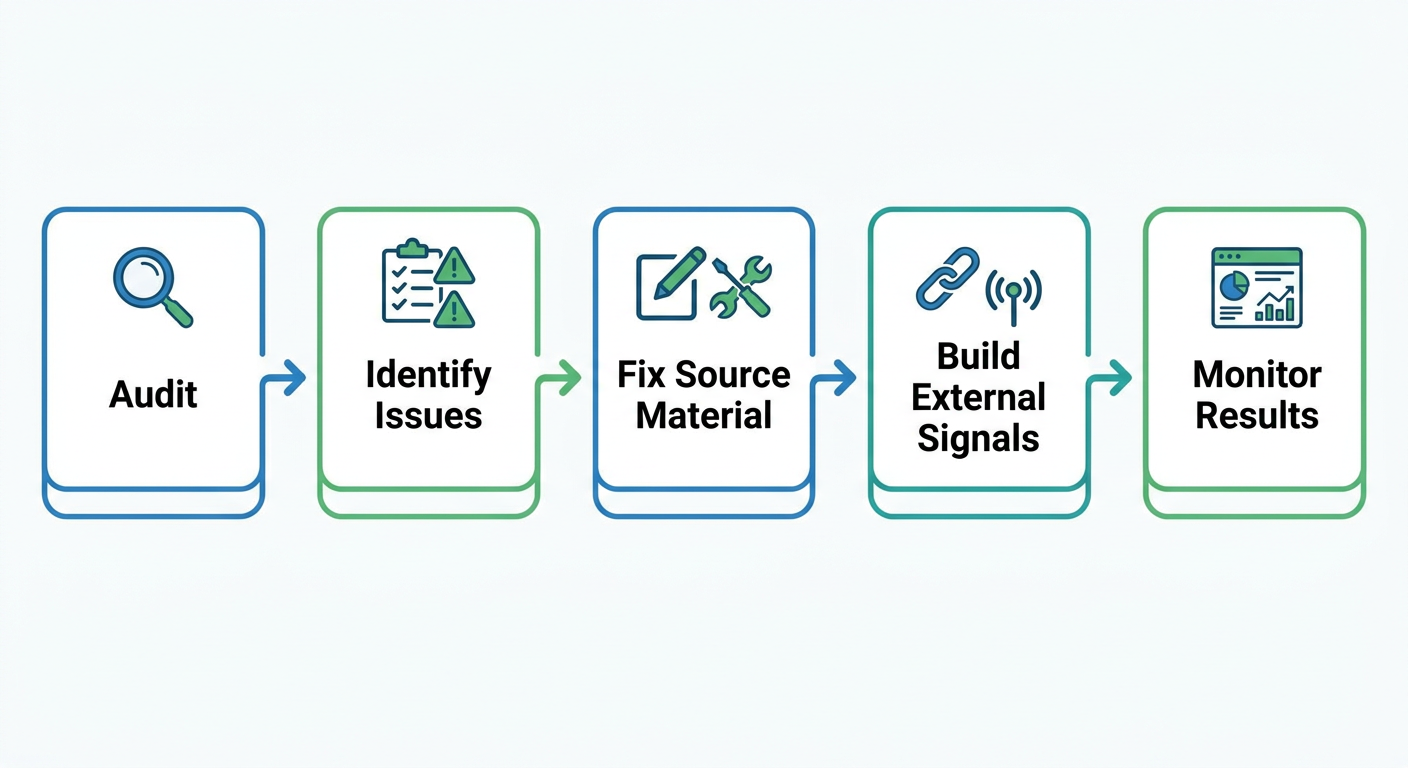 Actualiza el material fuente. Los modelos de IA aprenden de lo que está publicado en internet. Si tu sitio web todavía describe funcionalidades que has cambiado, precios que has actualizado o un posicionamiento que has abandonado, el modelo seguirá repitiendo la versión antigua. Realiza una auditoría de contenido y haz que cada página sea precisa, actual y específica.